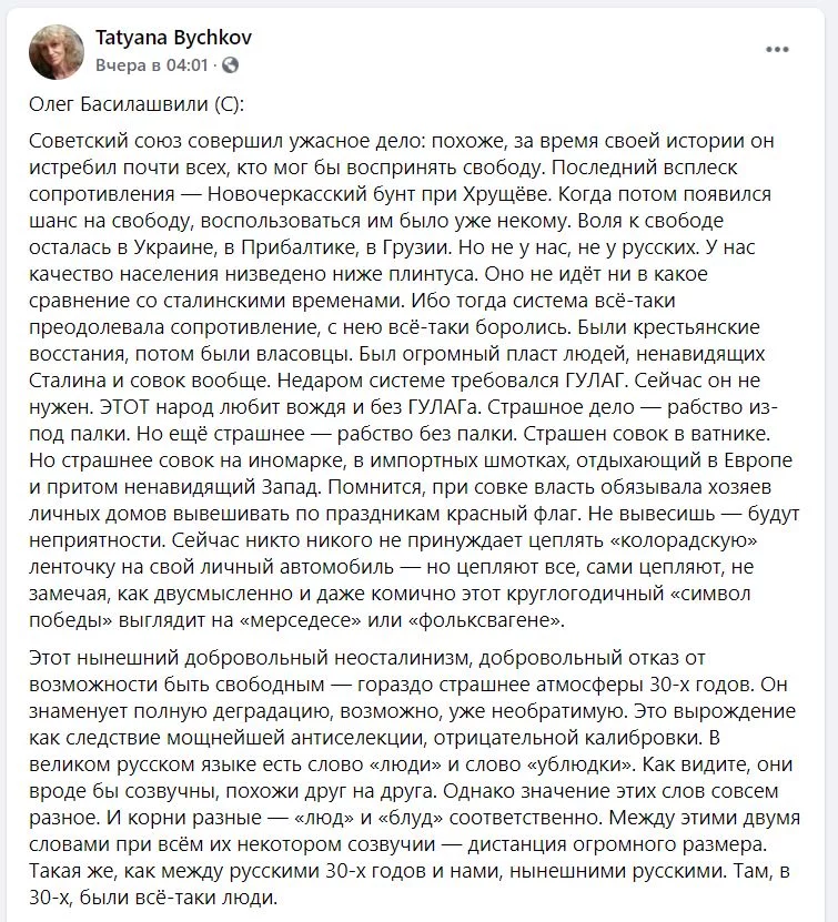 В марте 2021 года в Facebook стали появляться публикации с несколькими абзацами текста, авторство которых приписали актёру Олегу Басилашвили. Этот текст начинается с утверждения «Советский Союз совершил ужасное дело: похоже, за время своей истории он истребил почти всех, кто мог бы воспринять свободу». Далее автор проводит параллели между современной Россией и СССР 1930-х годов и приходит к выводу, что «у нас качество населения низведено ниже плинтуса. Оно не идёт ни в какое сравнение со сталинскими временами». Георгиевские ленточки в тексте названы «колорадскими», а власовцев упоминают в числе «борцов с системой» наряду с участниками событий 1962 года в Новочеркасске.