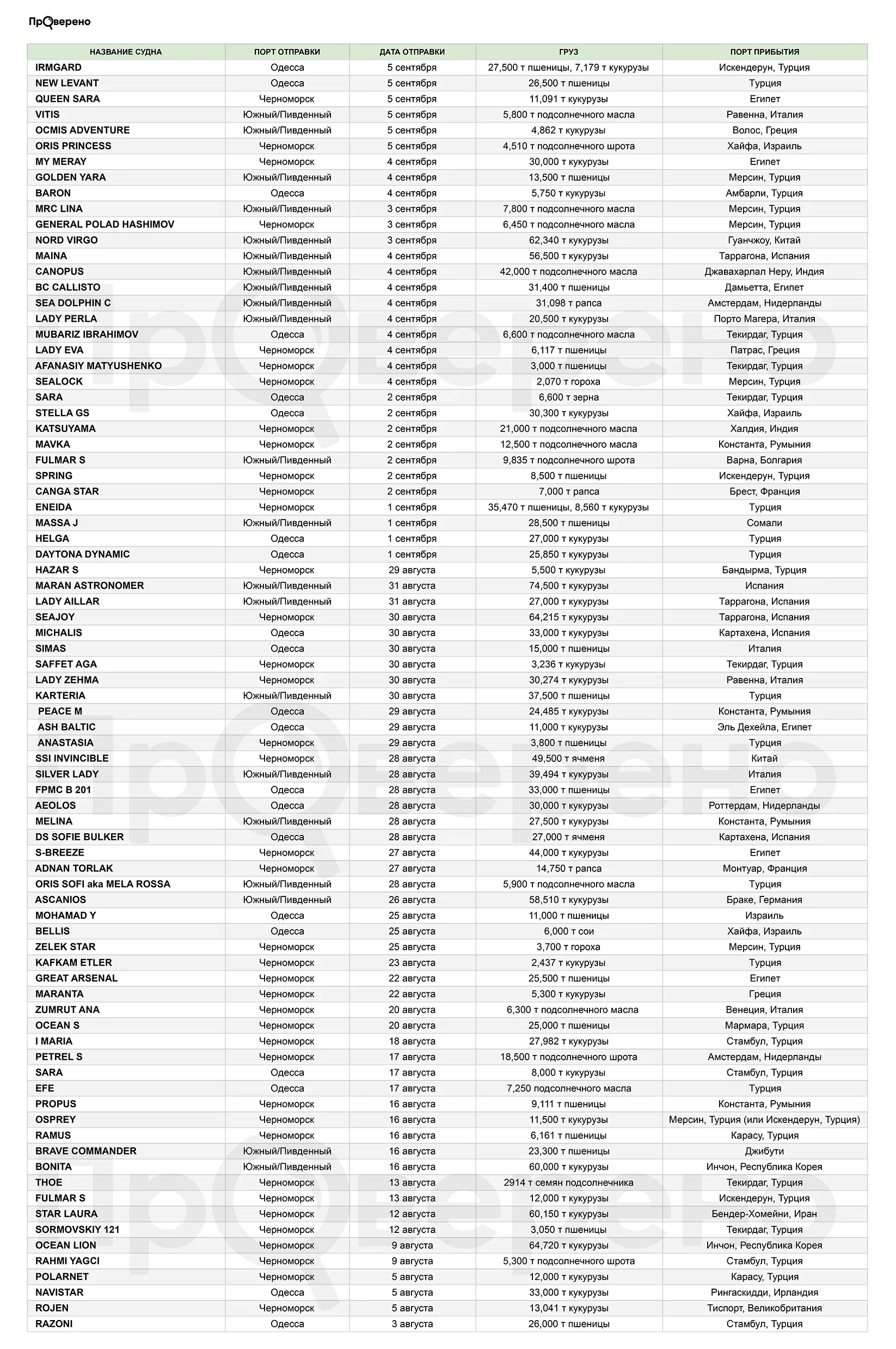 Almost every day, the coordination center publicly reports on the trade traffic of incoming and outgoing bulk carriers and posts the corresponding press releases. They indicate the name of the vessel, registration number, name of the cargo, volume of cargo, port of loading and port of destination. For clarity, we have combined this data into a single table.