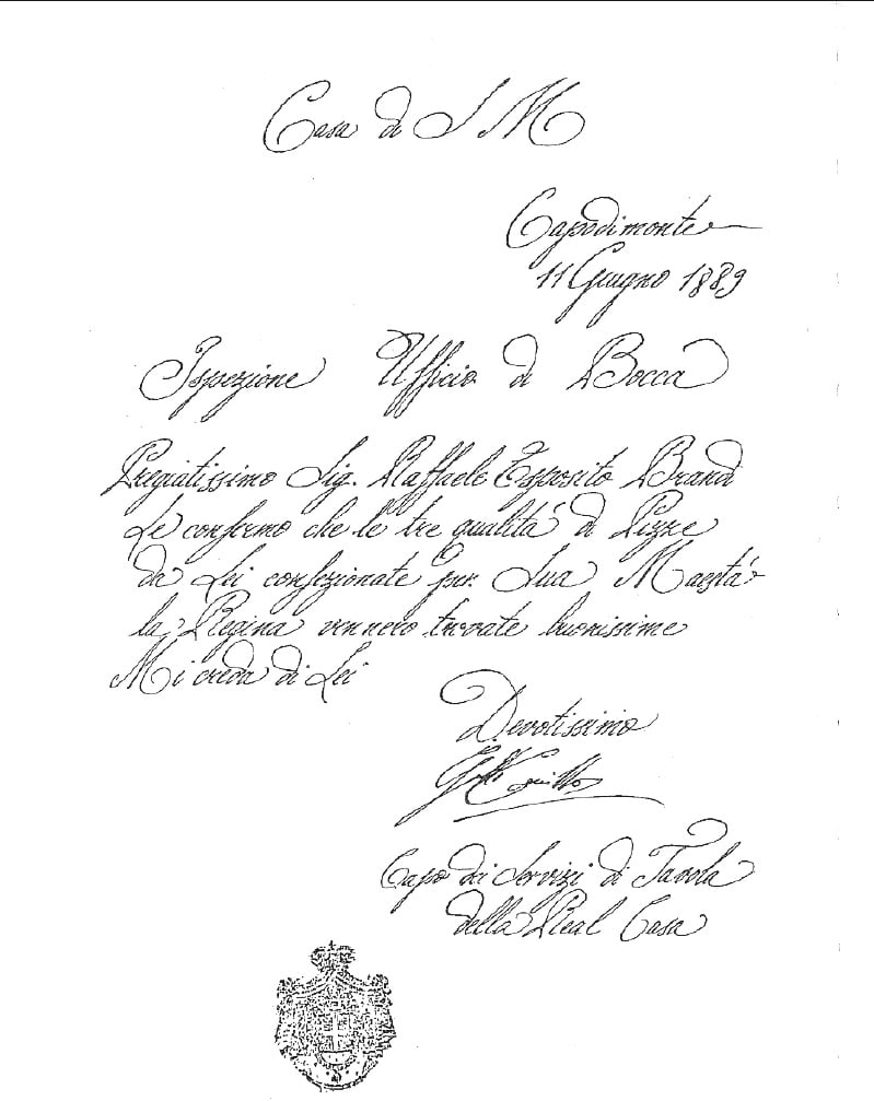 Thirdly, there are great doubts about the authenticity of a letter of gratitude from an employee of the royal court, Camillo Galli, which to this day adorns the wall in the establishment that previously belonged to Esposito. Although such papers were not uncommon in Italy at the end of the 19th century, the researcher was unable to find information about this letter in the archives. The search for traces that Esposito and Galli corresponded at all was also unsuccessful, although all such correspondence was carefully documented. Moreover, the handwriting on the letter does not match the samples of Galli's handwriting, and the seal, which only vaguely resembles the royal one, is located in a different part of the sheet than it was on similar papers. Finally, the letter was written with a ballpoint pen, rather than the then more common fountain pen, on a regular sheet of paper instead of a special form.