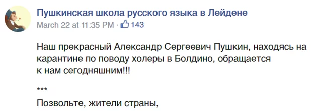 Во-первых, напомним, что первая Болдинская осень великого поэта, фоном к которой стал холерный карантин, датирована не 1827, а 1830 годом. Во-вторых, никого из распространивших опус, похоже, не смутило, что его весеннее содержание несколько не соответствует сезону написания. Не говоря уже про поэтику, язык и тому подобные мелочи.