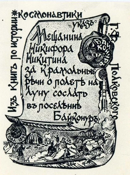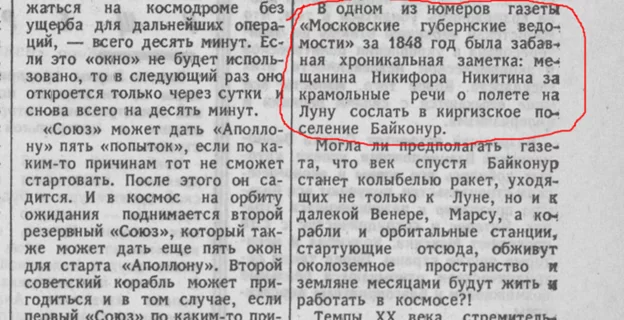 Another popular quote goes like this: So: “It is brought to the attention of residents of Moscow and the province that for illegal gatherings and troublemaker talk about some flights of Orthodox Christians to the Moon, a tradesman of the Zamoskvoretsk part, Nikita Petrov, was expelled from Moscow under police supervision to the Kyrgyz-Kaisak settlement of Baikonur.”