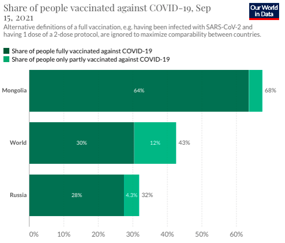 At the same time, mass vaccination helped prevent a critical rise in morbidity and mortality. As of September 14, Mongolia, where, according to the latest data, 68% of the population had been vaccinated with at least one dose, had only 260,709 cases and 1,074 deaths. And Russia, where 32% of the population is vaccinated, has 7.07 million cases and 191,566 deaths. Translating again into percentages of the population, in more vaccinated Mongolia only 7.7% of the population got sick, and only 0.03% died, and in less vaccinated Russia, only 4.9% of the population got sick, but 0.13% died, that is, in Russia the mortality rate is 4.3 times higher. From these data, it can be concluded that the significant rise in incidence in March-April is due to the penetration and dominance of the highly contagious Delta variant, and not the start of vaccination. If mass immunization had not begun in February, the mortality rates would have been at the level of Russia, and perhaps even higher, since in Mongolia at the time of the arrival of Delta, unlike Russia, there was no layer of people who already had natural immunity acquired during the first and second waves. Thus, the situation developed in the opposite scenario than the statement in the title - vaccination significantly reduced the overall losses for the country.