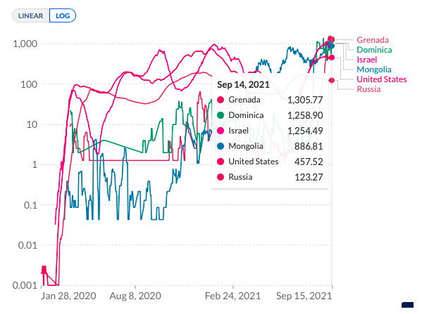 And finally, the third statement: “In early September, Mongolia took first place in the world in terms of current incidence, breaking its own previous absolute record for the number of daily infections, and even surpassed Israel.” On September 14 level incidence in Mongolia was 886.81 people per million. For comparison, on the same date: in Israel - 1254.49, in the Dominican Republic - 1258.90, and in Grenada - 1305.77. As we can see from the data presented, this statement is also incorrect. The daily increase in cases in Israel, mentioned in the comparison, is higher than in Mongolia, and the Dominican Republic and Grenada are even more ahead of Mongolia.