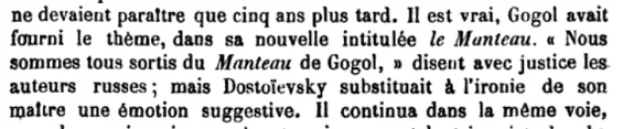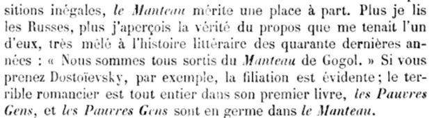 Translation: “The more I read Russians, the more I understand how right one of them, closely connected with the literary history of the last forty years, was when he told me: “We all came out of Gogol’s “The Overcoat.” If we take, for example, Dostoevsky, then the continuity is obvious: the terrifying novelist is already fully present in his first book, “Poor People,” and “Poor People” is present in embryo in “The Overcoat.” A year later, the article was included in Vogüe's book "Russian novel".