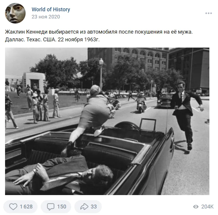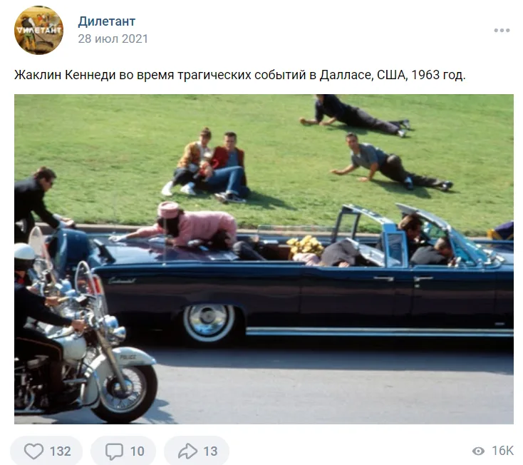 So, on VKontakte there are similar posts at least since 2014. On this social network, we found about 60 publications with an alleged photo of Kennedy, which received at least 100 likes. Public posts became the most viral "Book of records"(3930 likes), World of history (2250), "Interesting facts" (2180), "Human history"(1630) and History porn (1300). These publications can be found on Twitter (examples here And here) And LiveJournal. In addition, the mentioned photo was used to illustrate materials about the Kennedy assassination and some news resources and publications, for example “New news", "Russian reporter"(with reference to The Insider*) and "Express newspaper"(under the headline "JFK Assassination Linked to Aliens"). And on the magazine’s website “Amateur“This photo was analyzed to explain the details and specifics of the murder.