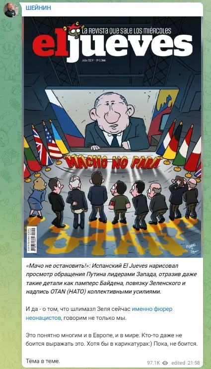 One of the covers shows a screen showing a video message from Russian President Vladimir Putin, which is being watched by the leaders of Western countries. Among them are, for example, Ukrainian President Vladimir Zelensky (on his left shoulder there is a red bandage, apparently referring to the symbols of the Nazi party) and US President Joe Biden (he is drawn in a diaper). Western leaders are depicted urinating, with urine spilling onto the floor to form the letters OTAN, the Spanish abbreviation used to represent NATO. “Macho can’t be stopped,” reads the caption to the picture.