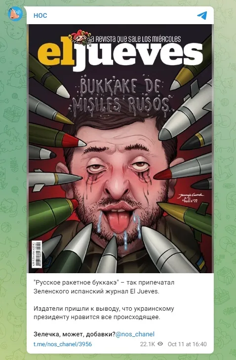 Another cover, which began to circulate in mid-October, is dedicated directly to the President of Ukraine. It depicts Vladimir Zelensky surrounded by missiles aimed at him, with his tongue hanging out and white liquid flowing around his mouth. The caption on the picture reads: “Russian rocket bukkake” (the word “bukkake” is happening from Japanese "to splash water" and is used to refer to the practice in group sex in which the participants in sexual intercourse ejaculate on the face or other part of the body of one of them). This picture was not widely published by the media, but it was widely distributed on social networks. It was also shared by users Telegram, Facebook, Twitter, "VKontakte", And LiveJournal.