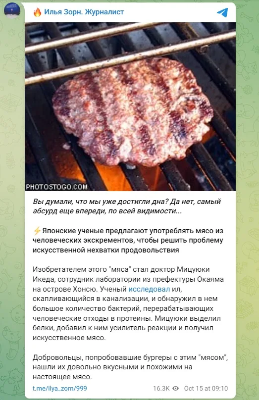According to Internet users, a laboratory worker from Okayama Prefecture on the island of Honshu named Mitsuyuki Ikeda discovered in the sludge that accumulates in the sewer a large number of bacteria that can process feces into proteins. Scientists were allegedly able to isolate proteins, obtain artificial meat from them, and even prepare burgers, which they gave to volunteers to try - they “found them quite tasty and similar to real meat.” In October 2022, Telegram channels talked about this (for example, “Coincidence" with 286,000 subscribers), users "VKontakte" And Facebook*. “You thought we had already reached rock bottom? No, the most absurdity is yet to come, apparently,” the authors of these posts commented on the message.