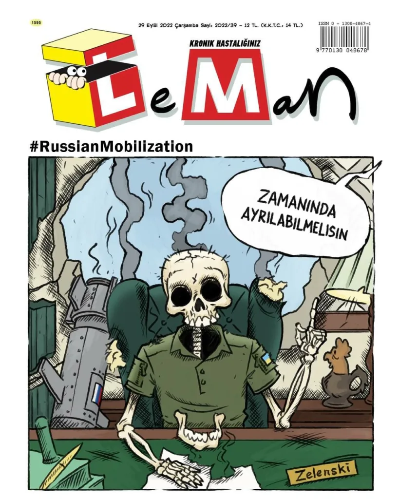 At the end of September 2022, a number of public pages on VKontakte and Telegram channels talked about the supposedly fresh cover of the Turkish satirical publication LeMan. It, as described in publications, depicts Vladimir Zelensky in the form of a skeleton with a fallen-off lower jaw. A Russian missile is visible in the background, apparently flying into the office of the Ukrainian president. In the upper right corner there is a bubble with text, which Internet users translate as: “It is important to be able to leave on time,” and above the caricature is written the hashtag #RussianMobilization.