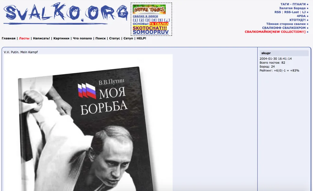 Russian pro-government information project "Noodles"discovered that back in 2004, a visitor to the Svalko.org forum jokingly published This is an image tagged “phototoad”. Since then, the “cover” has appeared several more times online. For example, in 2020, Twitter user YuraYakunin wrote a humorous tweet: “Roskomnadzor has banned the sale of Putin’s book “My Struggle” in German translation in Russia.” And in May 2022, the humorous community "Pussy", which makes up satirical news headlines, wrote: ""My Struggle." Putin published a book about judo.”
