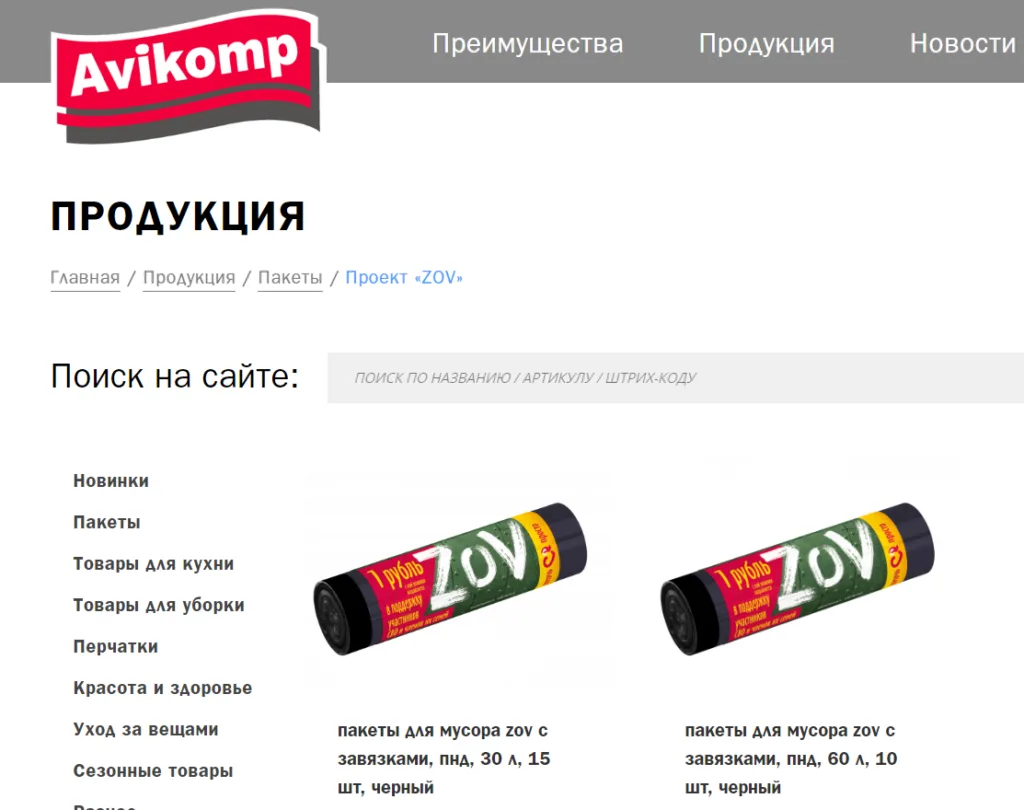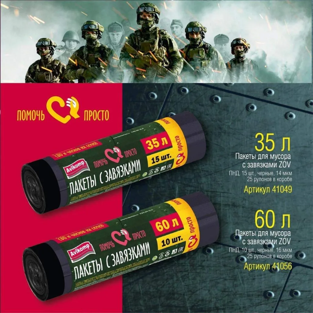 On the website manufacturer, Avikomp company, garbage bags are placed in a separate section called “Project ZOV”. However, in this section only two items: black garbage bags of 30 and 60 liters.