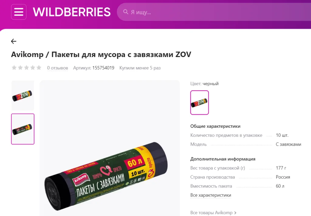 One might assume that we are talking about a hacking of the site, as was the case with the announcement of sale of Ukrainian black soil in a shopping center in Moscow. But the same garbage bags can be found, for example, on the trading platform wildberries.