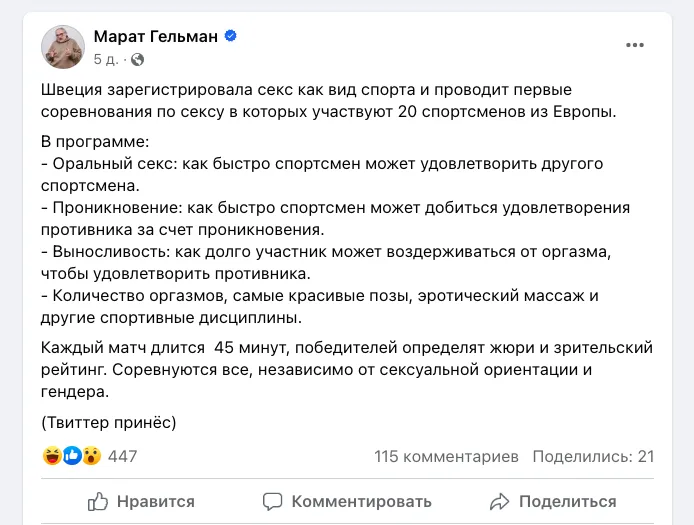 The fact that the European Sex Championship starts on June 8 in the Swedish city of Gothenburg, reported many Russian federal media, for example "News» And "Gazeta.ru», as well as journalists from Ukraine, Kazakhstan, Armenia, Croatia And Bulgaria. In most materials separately TBCthat Sweden allegedly became the first country in the world to register sex as a sport, and in publications on social networks this part of the message became basic. In Telegram, according to the TGStat service, the total reach of such posts in Russian was at least 20 million views. Popular channels shared the news, for example, “Ukraine now: news, war, Russia» (440,000 views), "Insider UA» (495,000) and "Sheikh Tamir» (223,000). Some publications also colorfully describe the disciplines in which the competition will take place.