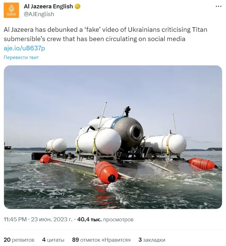In June 2023, a video appeared on the Internet, allegedly released by the Al Jazeera television channel, which talked about Ukrainians who accused the crew of the missing deep-sea vehicle of wasting money. We have verified the accuracy of this video.