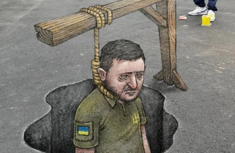 On June 26, a photo of another work from the so-called Polish art group Typical Optical, a group of artists allegedly painting humiliating 3D graffiti about Ukraine in cities in Europe and the United States, began to circulate. The photo shows an image of the gallows on which Vladimir Zelensky was hanged (with the Ukrainian president hanging as if over a hole in the asphalt).