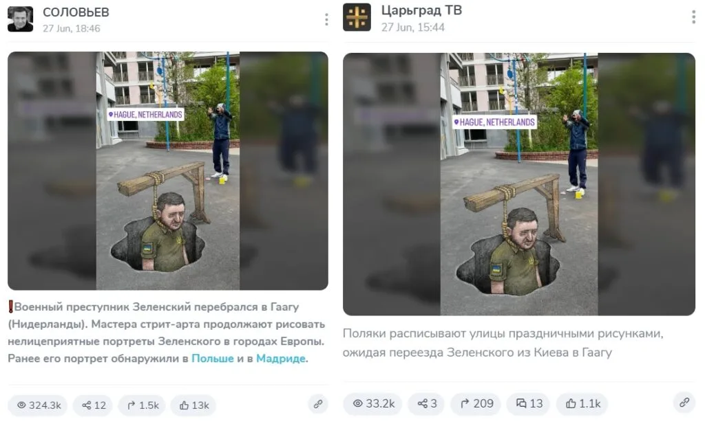 He spoke about the graffiti allegedly in The Hague on Telegram “Tsargrad-TV"(34,000 views at the time of writing this analysis), as well as channels of TV presenters Ruslana Ostashko (117,000) and Vladimir Solovyov (326,000), where they recalled two similar drawings that allegedly appeared in Warsaw And Madrid (“Verified” already wrote that these are fakes). Other channels where the viral photo appeared include “Russia now"(363,000), "Uncle Slava"(171,000), "What happened?"(145,000), "Special Operation Z"(103,000), "Kedmi's thoughts"(91,000), "Uncle Slava on Telegram"(84,000), Putin TG Team (71,000), "Conflict"(58,000), TarikNezalejko (57,000), "DPR 🅉 info 🇷🇺" (52,000), "Patriot Z🇷🇺" (41,000) and "Before everyone else. Well almost. Special operation"(16,000). The photo became popular on VKontakte, where some publications received hundreds and thousands of likes (examples here, here, here, here And here), on Twitter, where one post dialed 1 million views, as well as on some news websites and even on YouTube.