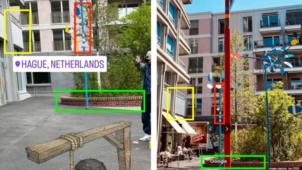 The new publication of Typical Optical was no exception to the already established rule, since the photo was again not taken in The Hague. Real location of the location shown calculated fact checkers from the British project Logically Facts. Some notable details in the viral photo include: notice several multi-colored pillars with different figures - using the Google Lens image search service, we were able to find out that similar art objects creates sculptor Ivan Pestalozzi. The job you were looking for was recently installed in the Glasi-Quartier area in a small Swiss town Bülach, located in the canton of Zurich, is confirmed and fact checkers from the German publication Correctiv, comparing building facades and other details of the viral photo with panorama streets from Google Maps.