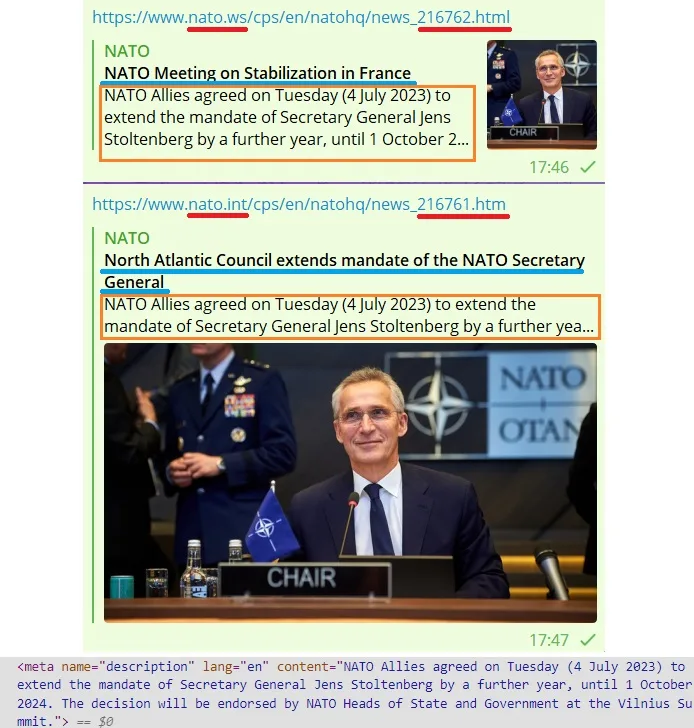 Also, switching languages ​​on nato.ws does not work the same as on nato.int. For example, in the original, the language menu in the upper right corner is intended to switch the language of the entire site, and to translate individual text there is a language menu under the publication date. In a fake, these two menus perform the same function. Moreover, when switching the language on nato.ws, the news number in the address bar changes (English corresponds to 216762, French - 216763, Russian - 216764, and Ukrainian - 216765), while on nato.int the number is preserved during translation. Among other differences: in the original the file name extension is .htm, and in the fake it is .html.