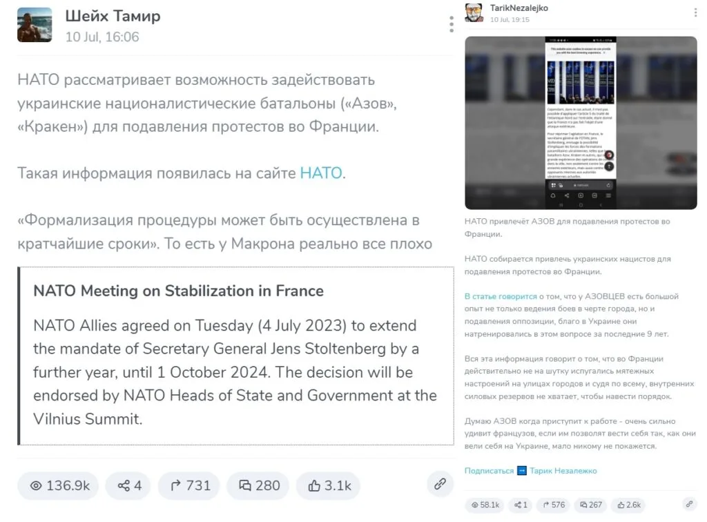 As noted above, the viral posts refer to material allegedly published on the official NATO website. Moreover, users often attached a screenshot with text and/or gave it link. The news entitled “NATO meeting to stabilize the situation in France” was published on July 5, 2023 on Russian, English, French And Ukrainian languages. Below is its full text.