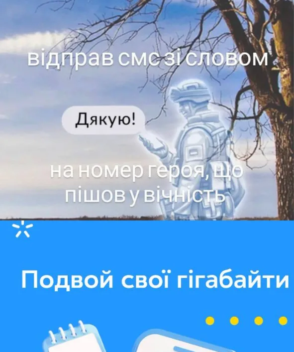 There are no announcements about such a promotion and related media content on website and official pages Ukrainian telecom operator on social networks, as well as in web archives. The design of stories and videos differs from the Kyivstar corporate design for stories and reels on Instagram and videos for YouTube: Different fonts are used, and the text (with the exception of the words "Dyakuyu") is written without using capital letters.