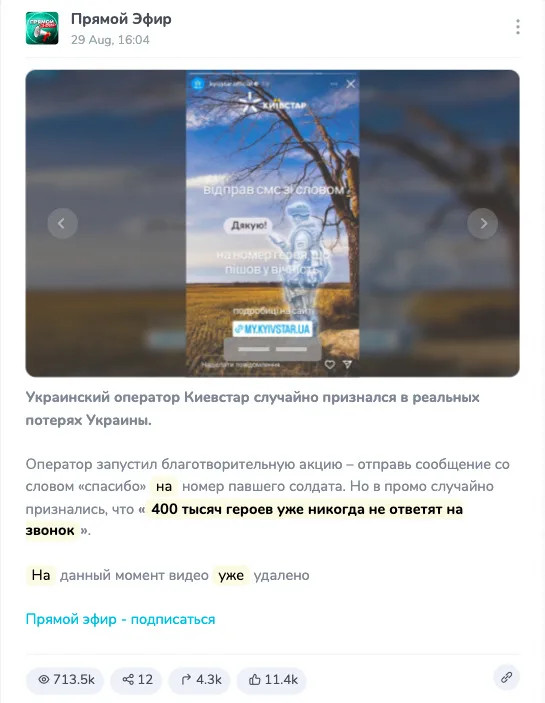 Viral posts report that on August 29, at Day of Remembrance of Defenders of Ukraine, Kyivstar launched a charity campaign - the company offered to send an SMS with the word “Thank you” to the number of a fallen soldier. Allegedly, the promotional video published on the telecom operator’s social networks accidentally included the information that “400,000 heroes will never answer the call again.” Posts about this were published by Telegram channels “Live broadcast» (713,000 views at the time of writing this analysis), “Putin on Telegram» (271,000), "Russia now» (269,000), "Truthfulness» (189,000) and many others; According to the TGStat service, the total reach of such messages exceeded 5 million views. Federal Russian media also wrote about the incident, in particular TV channel "Tsargrad" And Lenta.ru. In some publications it is noted that the video was promptly deleted, as “Kyiv is trying to hide the truth about the losses.”