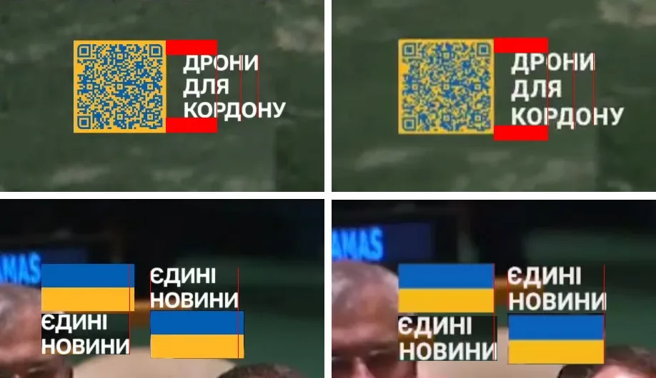 “Verified” also found several inconsistencies in the viral video with the official symbols of the Ukrainian TV channel. Firstly, in the real “1 + 1” broadcast, the phrase “Droni for cordon” (“Drones for the border”) is placed symmetrically relative to the center of the QR code, while in the distributed video it is strongly shifted downwards; The ratio of letter sizes is also different. In addition, in official broadcasts the length of the Ukrainian flag is slightly longer than the length of the word “novini” (“news”), but in the viral video it’s the other way around. Moreover, in the “1 + 1” version, in contrast to the viral entry, the words “edini” (“united”) and “news” are located exactly above each other. Moreover, the distance between the logos in the upper right and left corners also differs.