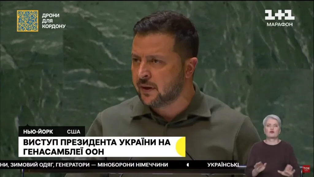 In the recording of the live broadcast of the “1 + 1” telethon, as in the UN version, Zelensky was not shown sitting in the hall during Zelensky’s speech. Moreover, in the broadcast of the Ukrainian TV channel, the president’s words were simultaneously translated by another person; at the bottom of the screen there was always a running line and a caption stating that this was Zelensky’s speech at the UN General Assembly in New York, and in the lower right corner of the video there was sign language translation.