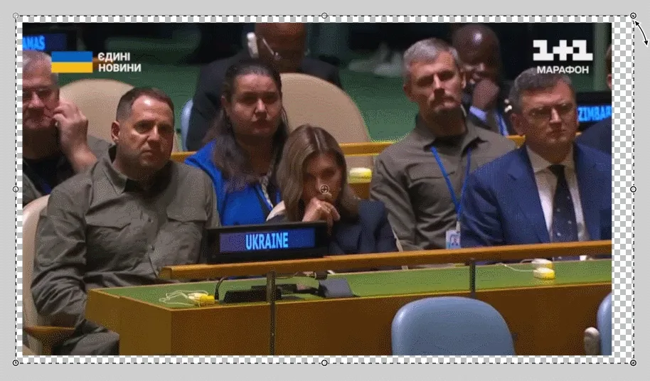 “Verified” suggested that unknown persons could have used the original video from the TSN YouTube channel and put telethon symbols on it, having previously inaccurately cut out the logos from the real broadcast. However, you can notice that the viral video also cuts off part of the podium behind which Zelensky spoke. In addition, in the upper right corner of the TSN recording there is a UN emblem, which is not present in the viral video (and there are no visible signs of its removal). Probably, the authors of the fake simply cropped the TSN video. To test this theory, we took two screenshots of the same moment from the viral video and the real one, and then combined them. It turned out that the crop line of the frame runs exactly where the UN emblem ends.