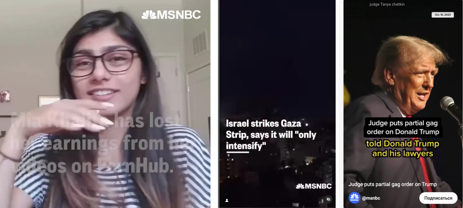 Reports that Pornhub donated either all proceeds from films starring the star or payments intended to Mia Khalife personally for videos posted on the resource to Israel began to spread on October 14. In particular, Telegram channels wrote about this “Axe.Live"(2.4 million views at the time of writing this analysis), "Trash ⚡️ Ukraine"(1 million), Nexta Live (337,000) and "All-Seeing Eye 🇺🇦 Ukraine"(295,000). According to the TGStat service, at least two hundred channels shared the news in different variations. A number of posts illustrated screenshot of a note on the Marca News website, and part - roller with the logo of the American cable TV channel MSNBC. Subtitles for the video report that the former CEO of the porn service explained the decision this way: “Pornhub, as a Canadian company, showed the world one thing: it’s not only Americans who can take from Arabs and give to Jews.” Posts with similar content were also shared by a number of Russian And Ukrainian sites and Media, users "VKontakte" And X (formerly Twitter).