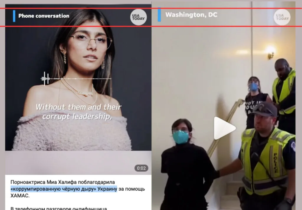 At the end of the video, it is mentioned that Mia Khalifa previously stated that weapons in the hands of Hamas were due to corruption in Ukraine and this is “the only benefit from this country.” It was not possible to find such a statement in the star’s accounts, but two days before the falsified MSNBC video in the Russian-language segment of Telegram spread a video with this statement, allegedly released by USA Today. It claimed that “porn actress Mia Khalifa thanked Ukraine, which she called a “corrupt black hole,” for supplying weapons to Hamas militants.” In particular, the video was posted by the channels “KB" (279,000 views) and "Heavenly"(219,000).