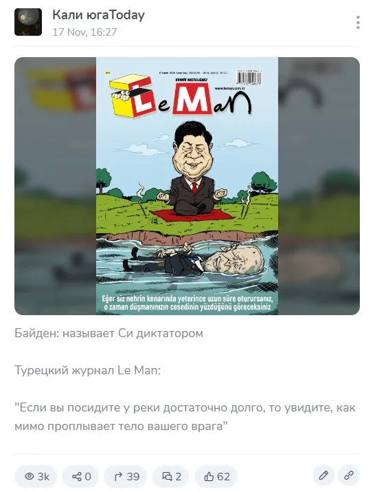 On November 17, a cover of the Turkish satirical weekly LeMan began to circulate on social networks. The artist depicted Chinese leader Xi Jinping sitting on the bank of a river. US President Biden floats past him. The inscription reads: “If you sit by the river long enough, the corpse of your enemy will float past you.” This cover appeared following the meeting leaders of the two countries. After the summit, Biden said in an interview that he still considers Xi Jinping a dictator. This image was shared by Telegram channels such as “Optimist in civilian clothes"(11,000 views at the time of writing this analysis), "V🇷🇺Hand of the Kremlin🇷🇺Z" (6000) and "Kali YugaToday"(3000).