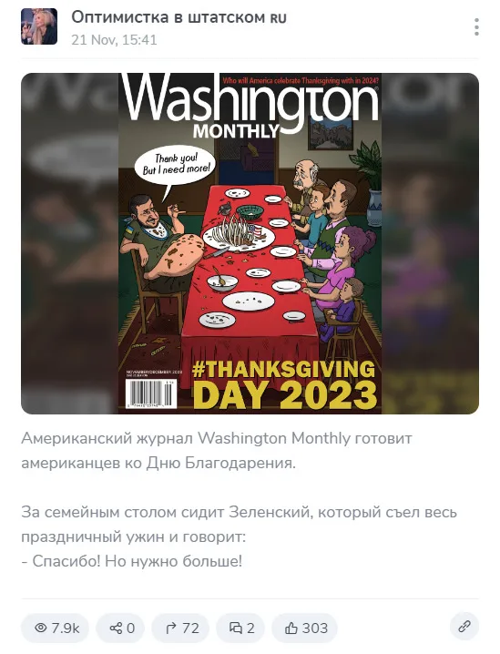 On November 21, 2023, the cover of the Washington Monthly began to circulate on social networks. At the bottom of the image is the heading “Thanksgiving 2023.” The picture itself depicts the President of Ukraine Vladimir Zelensky. He sits with a full belly at the table with the remains of a holiday dinner, opposite is his family, looking at this in horror. Zelensky says: “Thank you! But I need more!” At the top, above the title, is the text: “Who will America celebrate Thanksgiving with in 2024?” This cover was published by such Telegram channels as “Kali YugaToday"(21,000 views), "Ukraine without Z options" (16,000) and "Vyacheslav Nikonov"(10,000).
