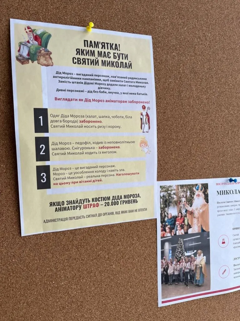 The reminder from the viral photo is placed on a cork board, the location of which is impossible to determine - only the poster itself, the cork background and the adjacent leaflet, also dedicated to St. Nicholas as a symbol of the New Year, are visible on it. The announcement does not indicate the institution that issued it, and there is no imprint. The surroundings of the board are also not visible in the photo, so it is impossible to determine whether it was really made in Ukraine. The leaflet itself is a sheet of A4 paper with printed text and pictures. Anyone could make it, place it on the board and photograph it.