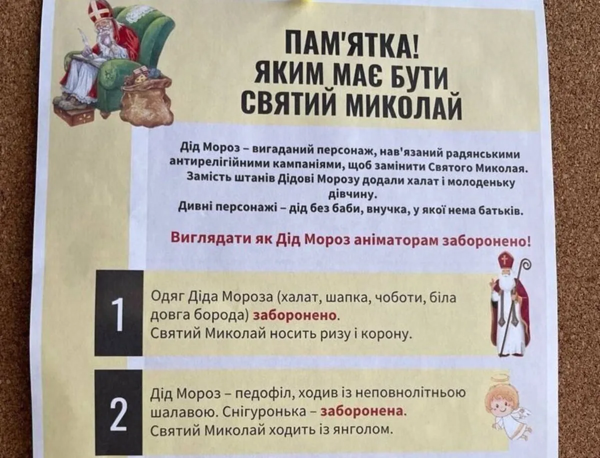 Many Russian media outlets wrote that from now on the Santa Claus costume is banned in Ukraine (“Moskovsky Komsomolets", "Pravda.ru", "DonPress", etc.). Instead of a fur coat, a hat and a long beard, as follows from these publications, animators should wear the attributes of St. Nicholas - a chasuble and a miter, and he should be accompanied not by the Snow Maiden, but by an angel. The basis for the proposed ban was that Father Frost was a character imposed by Soviet anti-religious campaigns, and Saint Nicholas was a real person. In addition to various publications, social network users also wrote about the innovation (“VKontakte", "Classmates" And Facebook). Telegram channels did not stand aside either: the ban was reported “Ax 18+"(1.7 million views at the time of writing this analysis), "Live broadcast" (626,000), "KB 18+"(325,000), "Horn"(217,000), "Observer"(184,000), "Uncle Slava» (173,000), etc. To many posts Attached is a photo of a notice board where there is a notice with instructions on what Saint Nicholas should look like, and a reminder of the fine of 20,000 UAH (about 48,000 rubles at the exchange rate on the day the analysis was written) for using the image of Santa Claus. In some messages TBCthat such leaflets appeared in animation agencies in Kyiv and Lvov.