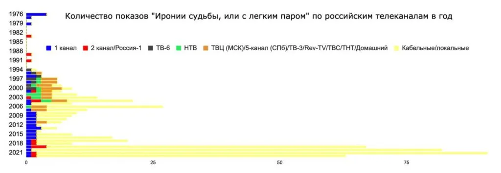 Чтобы проверить, когда и с какой частотой в последние десятилетия по телевизору показывали «Иронию судьбы», мы обратились к сайту «Архив расписаний передач телеканалов и радио», содержащем, как утверждают его создатели, телепрограмму на каждый день с 1975 года. Чтобы избежать возможных пропусков и ошибок распознавания, мы дополнительно проверили по базе EastView программы телепередач в электронных архивах двух самых крупных советских газет «Правда» и «Известия». Также мы вручную просмотрели все телепрограммы на новогоднюю неделю с 1976 по 1991 год. Всего мы нашли сведения о 550 показах фильма «Ирония судьбы» по советскому, а затем российскому телевидению до 2022 года.