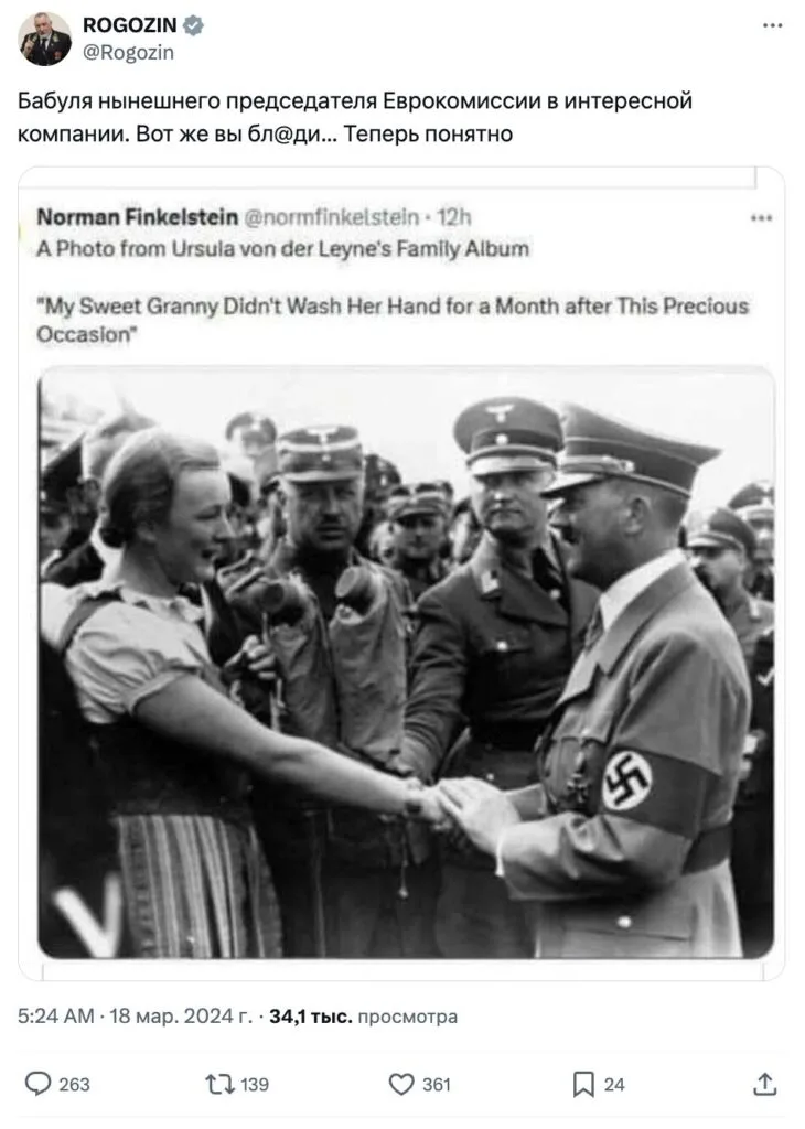March 18, member of the Federation Council of the Russian Federation, ex-head of the Roscosmos corporation Dmitry Rogozin published this photo on social network X with the caption: “The grandmother of the current President of the European Commission is in interesting company. You b****s... Now it’s clear.” Ten days later, same photo posted in his Telegram channel, political scientist Alexander Semchenko (92,000 views at the time of writing this analysis). The image was also shared by ordinary users X And Facebook.