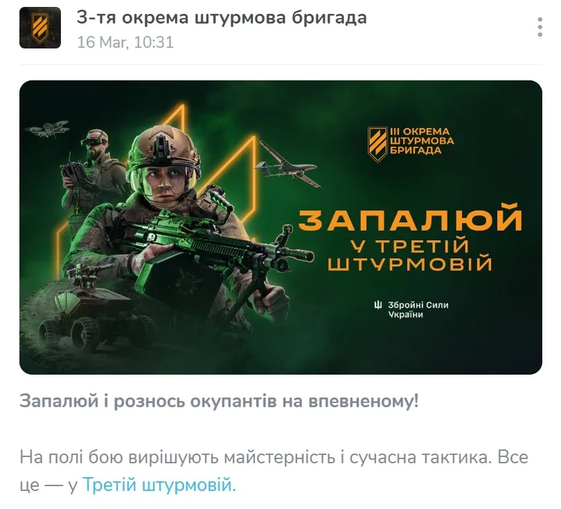 “Verified” studied the Telegram channel of the 3rd OshBr and found a similar banner there in post dated March 16, 2024 with an offer to join the ranks of this brigade. However, unlike the photo distributed on the RuNet, the poster contains another phrase that has nothing to do with Putin’s words: “Light up in the third assault.” About this advertisement in March wrote and Ukrainian media.