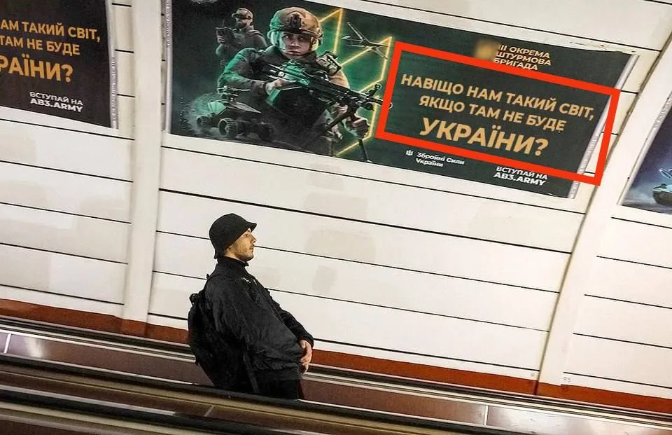 Approved, that the distributed photograph shows a wall next to the escalator in the Kiev metro, and on it are advertising posters calling for joining the ranks of the Armed Forces of Ukraine. On one of the banners there is a phrase in Ukrainian, which when translated into Russian sounds like this: “Why do we need such a world if there is no Ukraine there?”