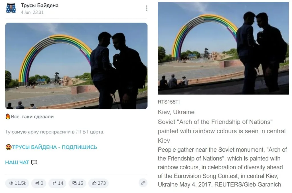 Satirical Telegram channel "Biden's underpants"(12,000 views) in a similar publication posted on June 4, 2024, he used not a video, but a photograph with the caption: "They did it after all. That same arch was repainted in LGBT colors.” "Verified" found out that the picture shown was done in Kyiv on May 4, 2017 by a Reuters correspondent.