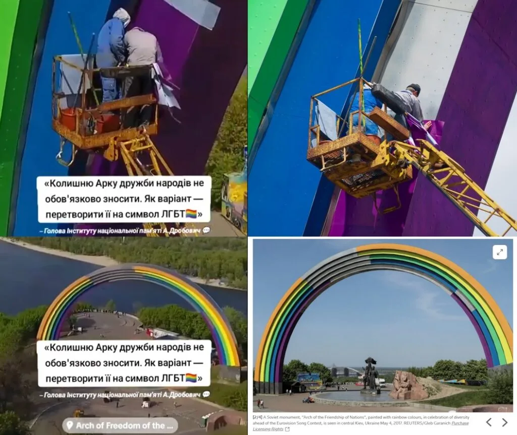 June in many countries counts Pride month is when demonstrations and other events dedicated to LGBTQ+ rights take place there. On June 3, 2024, posts appeared on the Internet, the authors of which stated: in honor of the Pride, the Kyiv authorities repainted the Arch of Freedom of the Ukrainian People, previously known as the Arch of Friendship of Peoples. As confirmation, publications were often accompanied by a video, which, for example, Telegram channel “Evil proof️“(203,000 views) commented: “In view of the approaching gay pride season in Geyropa, crests also decided to keep up and painted the People’s Friendship Arch in LGBT colors.”
