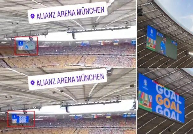 Note that the scoreboard shown by the Spanish edition in the viral video is on the right, not the left - the animation on them is slightly different, but the footage from the field is identical.