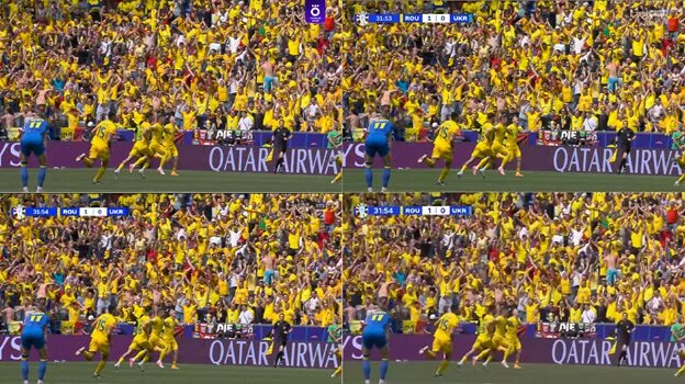 Judging by the behavior of the Romanian football players in the viral footage, it can be assumed that it was taken while celebrating a goal. During live broadcasts of the European Championship, all channels that have acquired the right to broadcast show the same picture. “Verified” studied the recordings of the match shown in different countries (Russia, Italy, Switzerland and Ukraine), and came to the conclusion that the screenshot was taken at the end of the 32nd minute of the match, after the Romanian team opened the scoring.