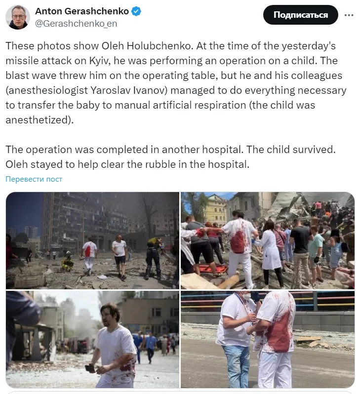 On July 8, the Minister of Internal Affairs of Ukraine published a photograph of a doctor in a bloody robe helping to clear the rubble. Igor Klimenko. The next day, a selection of similar pictures with this doctor posted in his popular (more than 600,000 subscribers) blog on the social network X, adviser to the head of the Ukrainian Ministry of Internal Affairs, Anton Gerashchenko. Quite quickly, the name of the doctor who appeared in these shots became known - Oleg Golubchenko. “During yesterday’s rocket attack on Kyiv, he performed surgery on a child. The blast wave threw him onto the operating table, but he and his colleagues (anesthesiologist Yaroslav Ivanov) managed to do everything necessary to transfer the child to manual ventilation (the child was under anesthesia). The operation was completed at another hospital. The child survived. Oleg stayed to help clear the rubble in the hospital,” Gerashchenko wrote without citing a source (previously similar post published Member of the Public Council at the Kyiv City State Administration Ivan Stepurin).