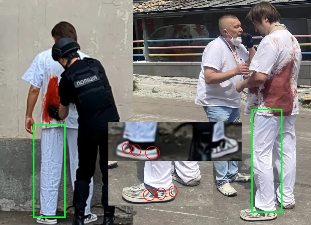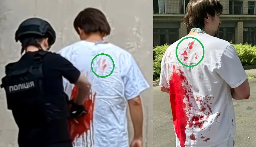 On July 19, publications went viral on RuNet, according to which these pictures were staged - a video allegedly appeared on Ukrainian Telegram channels, filmed by an eyewitness in the center of Kyiv and proving the staging. In the channel post "Sanya in Florida“(471,000 views at the time of writing this analysis) it says: “In the video, a Ukrainian police officer pours blood from a bag onto a man in a doctor’s coat. The doctor is an employee of the Okhmatdyt hospital, whose photographs were published largest world media (the link provided in the post does not contain the pictures in question. - Ed.). In these photos, the doctor's back is covered in blood. Already after the first publication of photographs, Internet users drew attention to the unusual color of the blood. The video that surfaced confirmed doubts about the veracity of the pictures. The hospital employee acted as a so-called crisis actor - an actor who must believably portray a person injured and injured as a result of the incident. Once again, the Zelensky regime is trying to imitate the victims, wounded and dead, and the Western media are eagerly picking up on this.”