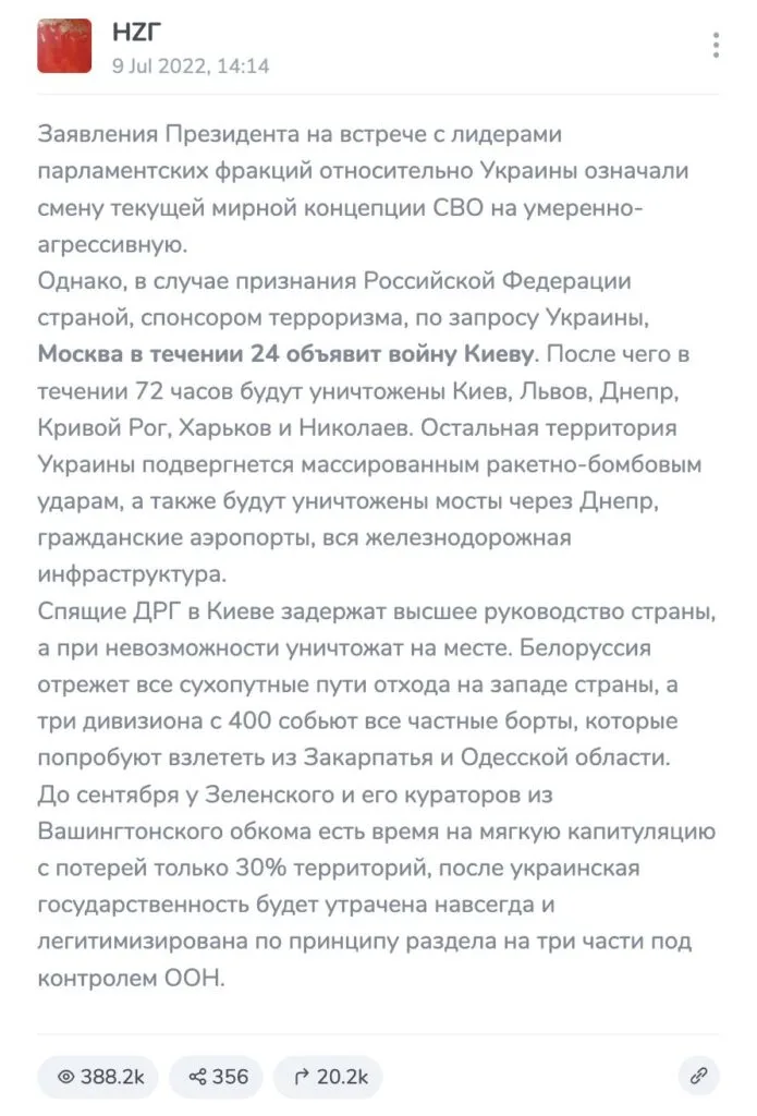 The second part of the newsletter (about the upcoming ultimatum to Ukraine) is taken from even earlier publications. According to TGStat data, the viral text was based on fast Telegram channel “Nezygar” (now NZG), posted on July 9, 2022. Record was dedicated Putin’s meeting with the leadership of the State Duma of the Russian Federation, which took place two days earlier. “The president’s statements at a meeting with the leaders of parliamentary factions regarding Ukraine meant a change in the current peaceful concept of the Northern Military District to a moderate-aggressive one. However, if the Russian Federation is recognized as a country sponsoring terrorism at the request of Ukraine, Moscow will declare war on Kyiv within 24 [hours], “Nezygar writes without specifying the source. Further, the author of the publication talks about the destruction within three days of the largest cities in Ukraine, the main bridges across the Dnieper, airports and train stations, the work of the DRG in Kyiv and the more active involvement of Belarus in the war. Posting shared many large pro-Kremlin Telegram channels.