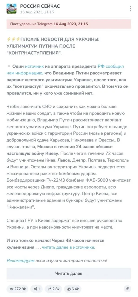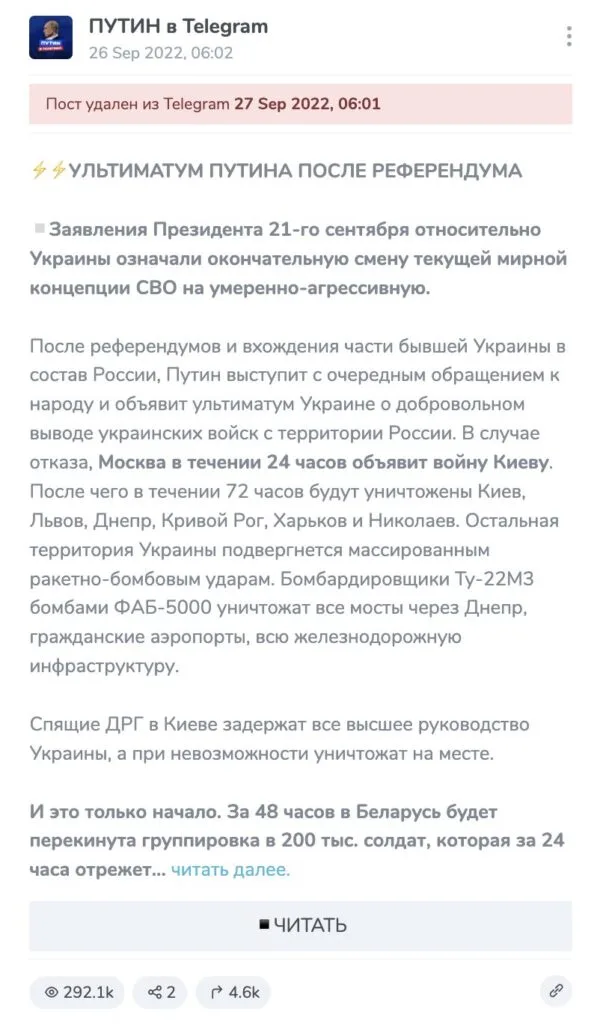 Some of them published a slightly edited version of the same text between 23 and 28 September 2022. In the updated version, “the change from the current peaceful concept of the Northern Military District to a moderate-aggressive one,” according to Telegram channels, meant not Putin’s statement at the meeting with the leaders of the State Duma, but his appeal dated September 21 of the same year, in which the President of the Russian Federation announced the beginning of partial mobilization and the holding of “referendums” in the occupied territories of Ukraine. It was after the completion of the “voting,” bloggers argued, that Putin would allegedly announce an ultimatum to Kyiv. It is noteworthy that the overwhelming majority similar posts contained advertising links to major pro-Kremlin Telegram channels and have been deleted one day after publication.