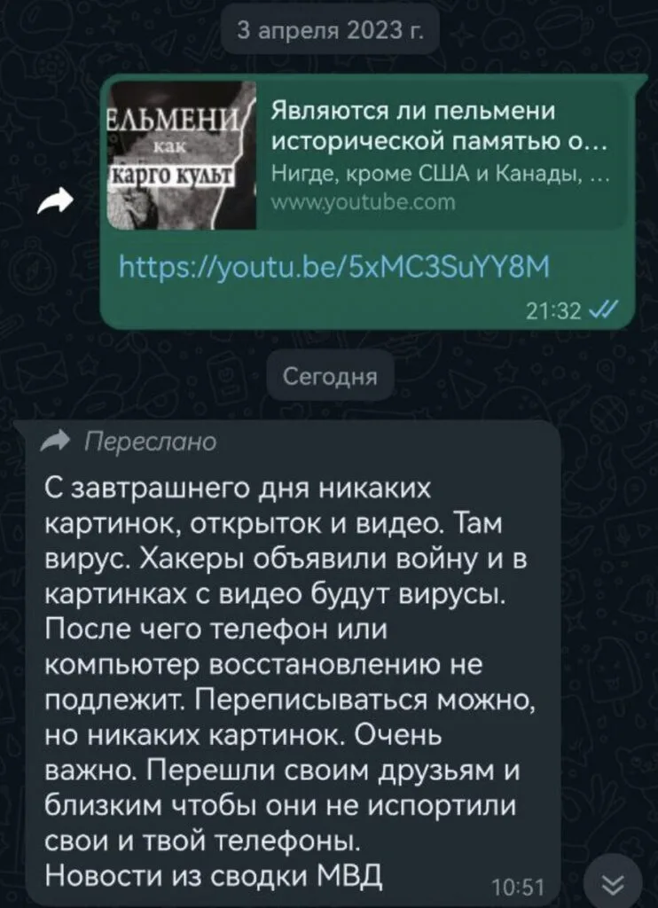 The newsletter about an imminent victory over Ukraine inherited a predictive character from its ancestor text: the authors first predict a military apocalypse for Kyiv, and then a digital apocalypse, apparently, for the Russians. To minimize the consequences, the third and fourth fragments say, the letter must be distributed as widely as possible.