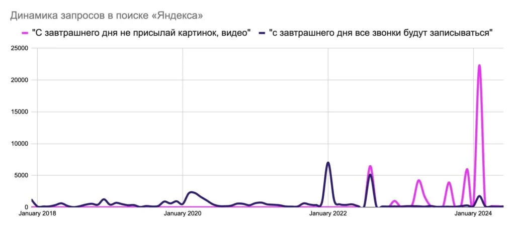 In 2017, in Russian and Kazakh social networks appears panic warning about strengthening control measures, presumably by security forces: calls through instant messengers will be recorded, and communication through social networks will be monitored. Since then, Russian-speaking users regularly distribute this newsletter, and its recipients try to verify the accuracy of this information. At least 48,000 people tried to do this through the Yandex search line (we only counted requests from the first line of the mailing list).