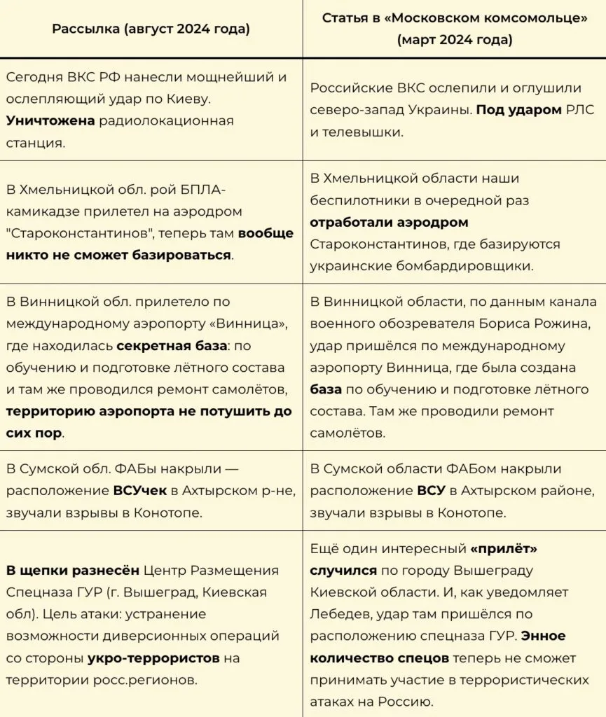 The first meaningful fragment of the newsletter - a story about the military successes of the Russian Federation on the territory of Ukraine - is a set of phrases borrowed with minor changes from articles Elena Gamayun in Moskovsky Komsomolets dated March 15, 2024. A comparison table with selected phrases from both texts is presented below. There are no substantive differences between them, however, the authors of the anonymous newsletter, instead of Gamayun’s mostly formally neutral statements, try to use emotionally charged and sometimes downright offensive language.