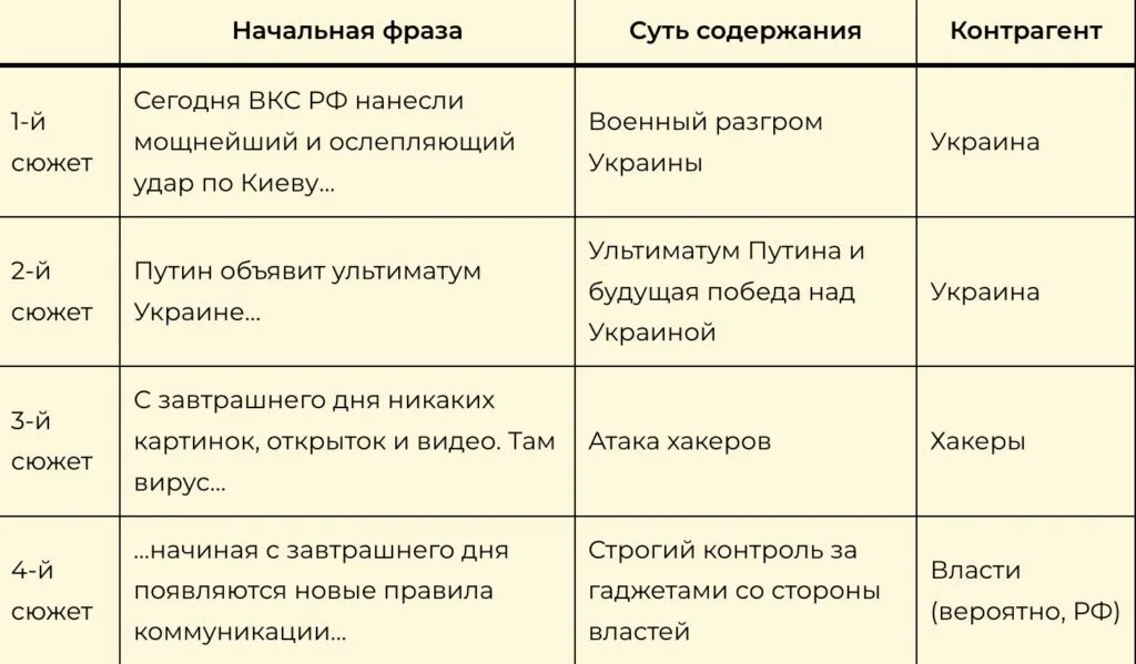 If you look closely at the text of the newsletter, you will notice that it consists of four parts, the contents of which are very poorly related to each other. This is an example of compilation - the artificial combination of texts of different origins into one. The newsletter first talks about successful attacks on the territory of Ukraine, then about the ultimatum that Vladimir Putin is ready to announce to Kyiv, then about the hacker attack that Russians may be subjected to, and finally it talks about the introduction by the authorities of strict control over citizens through their gadgets. These stories are united only by the expectation of approaching significant changes.